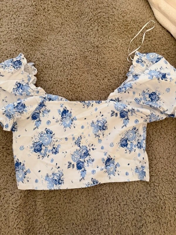The New Look White and Blue Floral Crop Top is available in sizes M.