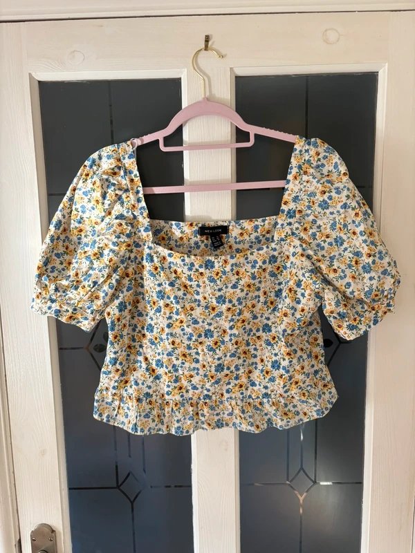 The New Look Floral Off-Shoulder Top in White and Yellow is available in sizes M.