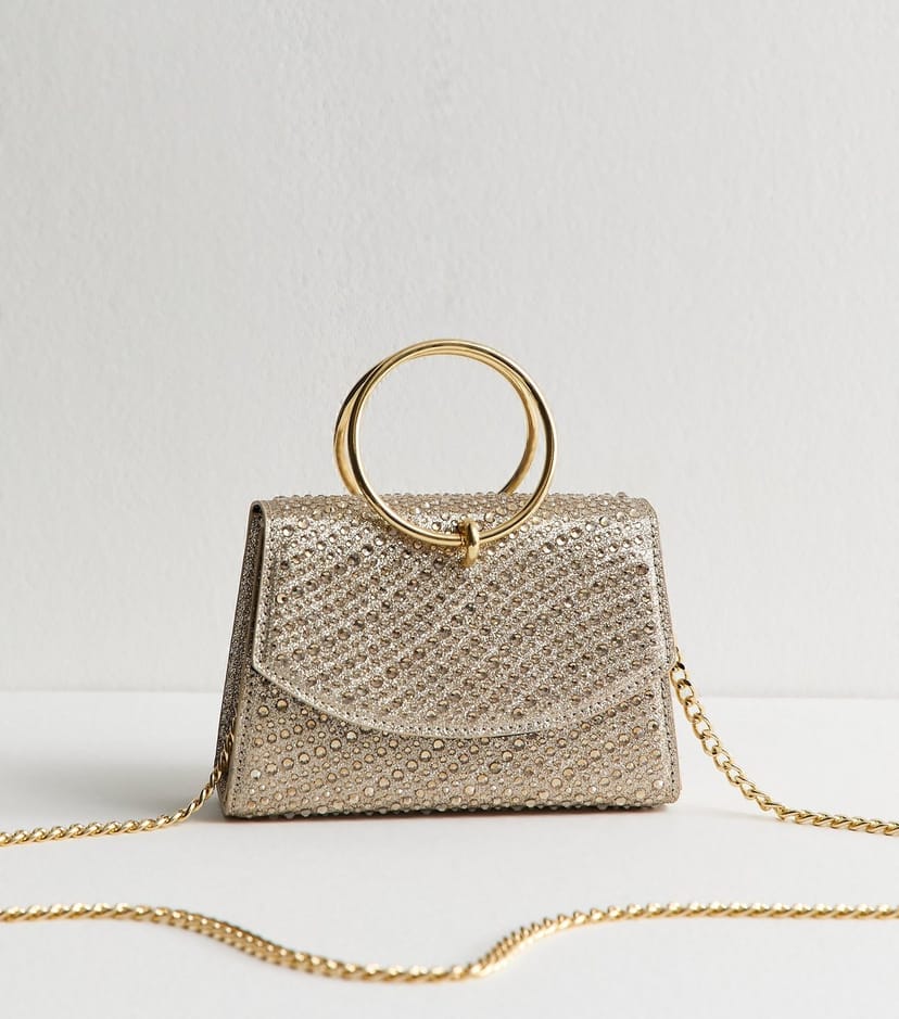 View New Look UK's returns policyThis gold diamante embellished top handle bag is a sparkly standout for nights out. Its made from glittery fabric and features two round handles and a detachable chain strap for versatile wear.