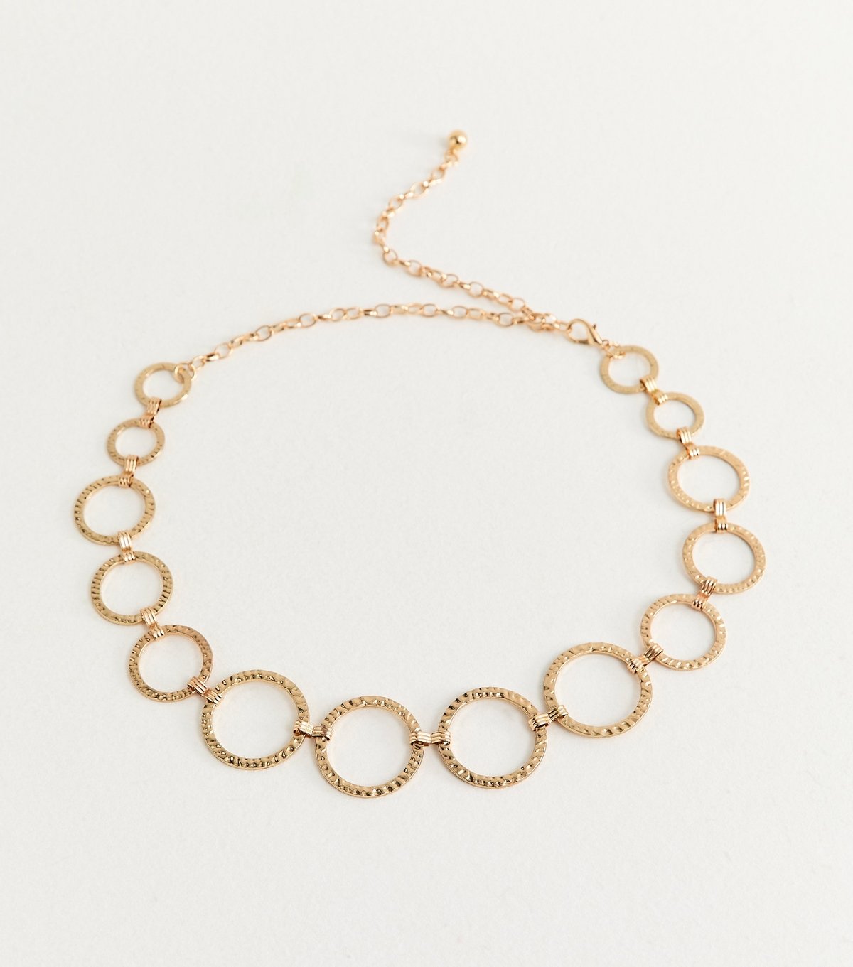 Stylish gold hammered circle chain belt from New Look. Features a chain design with textured circles, perfect for adding a touch of elegance to any outfit. Ideal for both casual and formal wear.