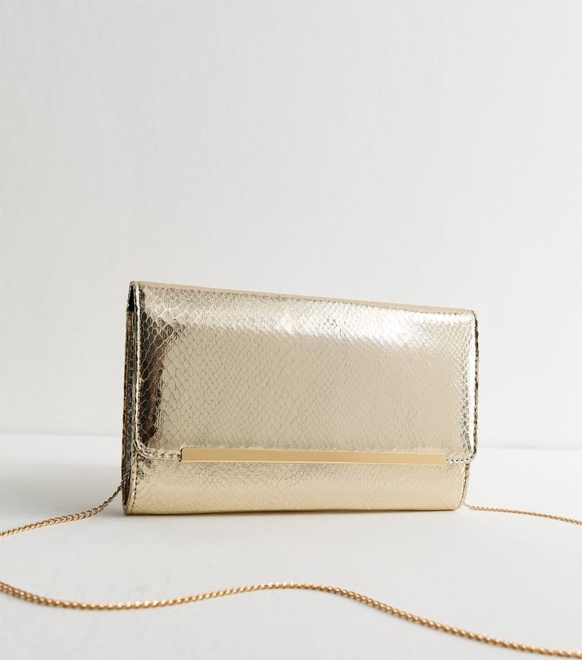 Elegant gold metallic snakeskin-effect clutch from New Look. Features a detachable chain strap for versatile wear. Ideal for evening events and special occasions.