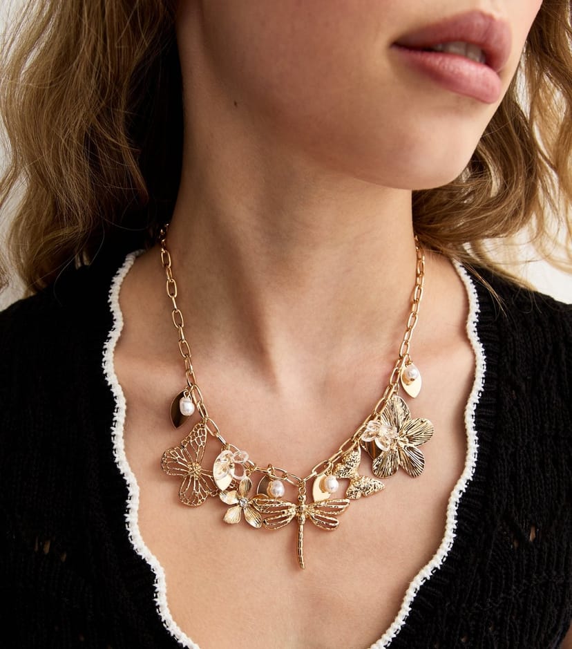 Charming gold-tone necklace from New Look featuring a delicate chain adorned with butterfly, flower, and faux pearl charms. A whimsical addition to any outfit.