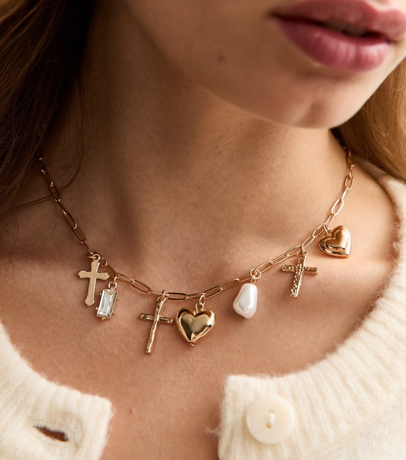 This gold tone chain necklace from New Look features a mix of cross, heart, and pearl charms. Perfect for adding a girly yet edgy touch to your casual outfits.