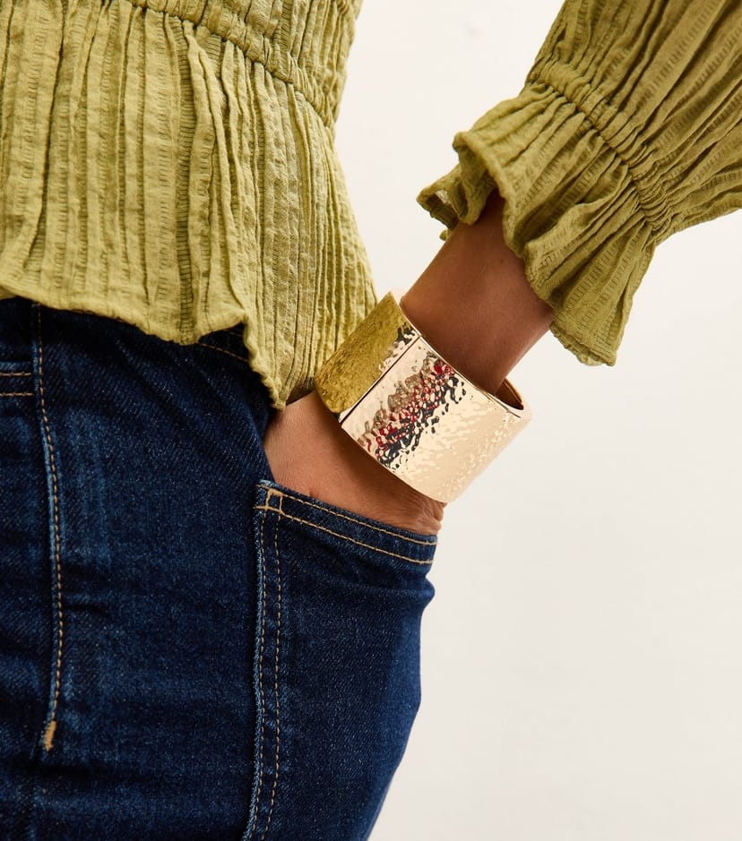 Elegant gold tone hammered texture cuff bracelet by New Look. Perfect for adding a chic touch to sleeveless and strapless outfits. Features a chunky design and hinge fastening for easy wear.