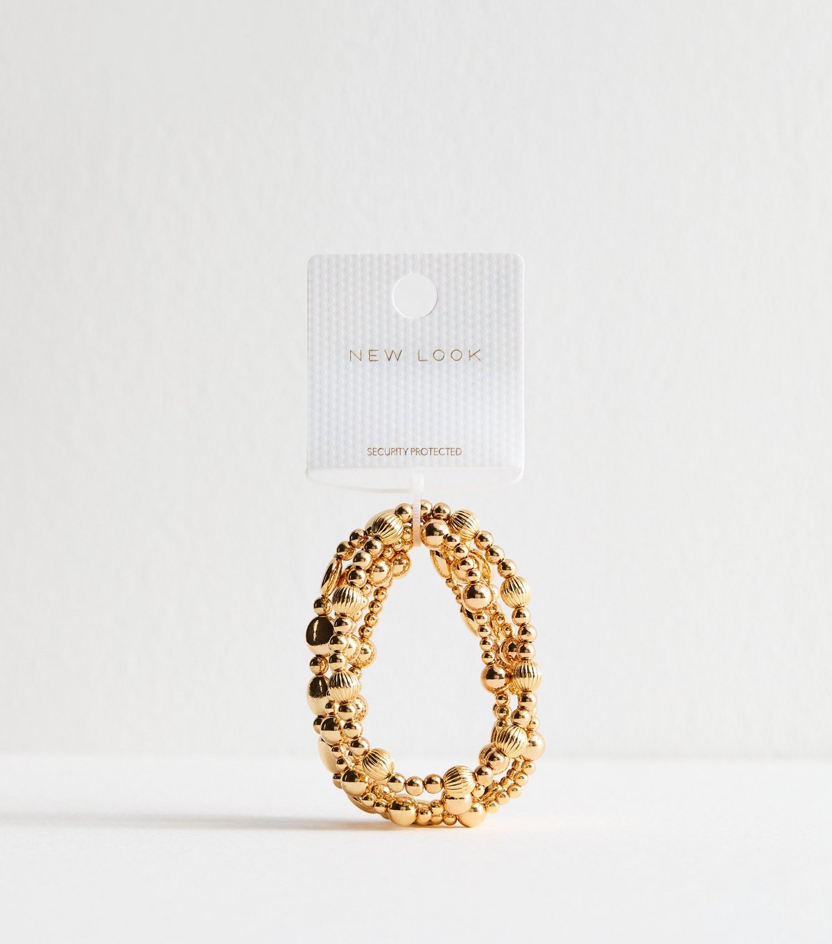 Elegant gold-tone beaded bracelets in a pack of five. Perfect for adding a touch of sparkle to any outfit. Each bracelet features a mix of sizes and bead designs.