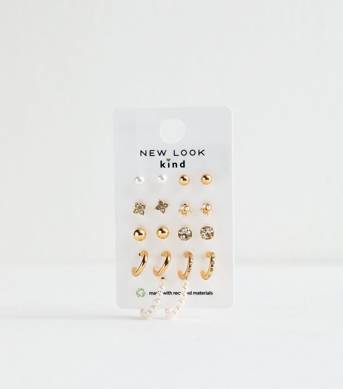 Versatile set of gold tone faux pearl and diamanté stud and hoop earrings. Perfect for mixing and matching to elevate any look. Comes in a pack of 9.