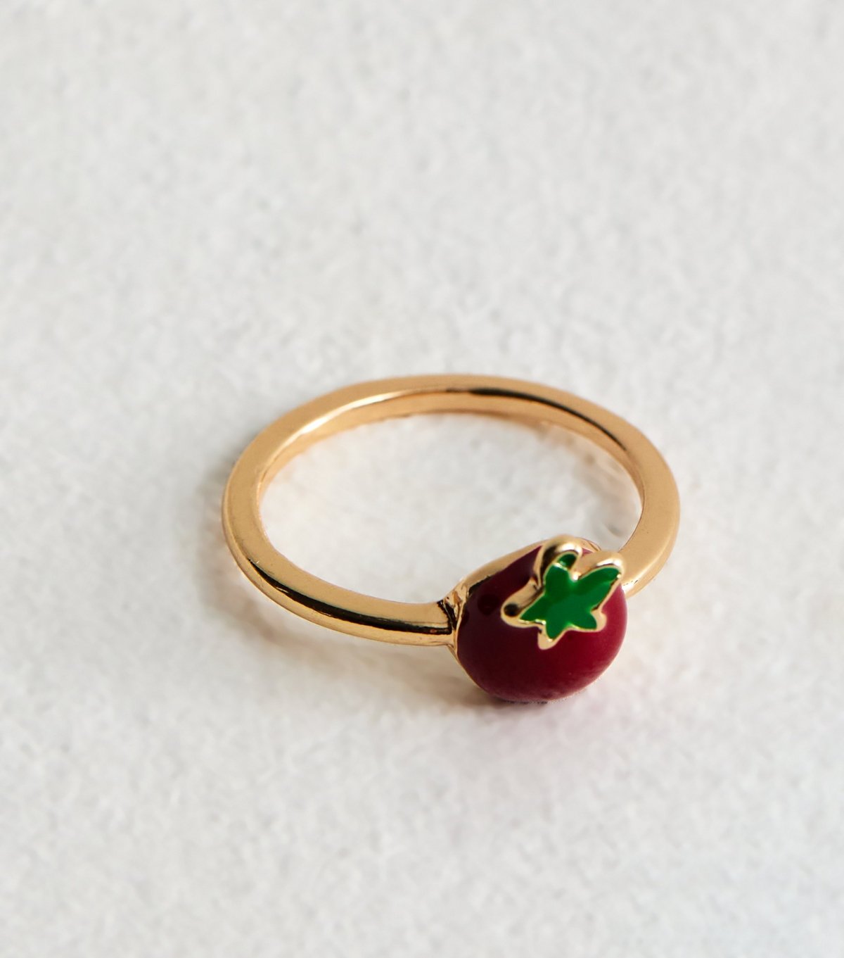 Playful gold tone ring featuring a red resin tomato with a green enamel leaf. A fun and quirky addition to any jewellery collection.