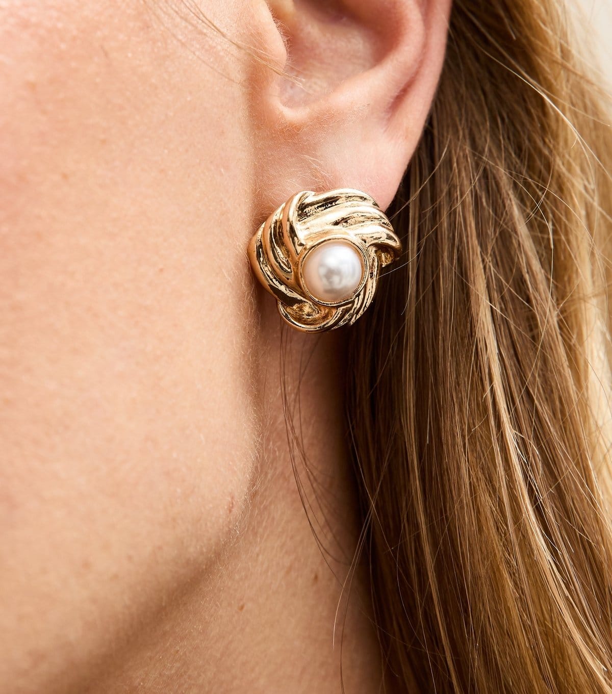The New Look Gold Tone Ribbed Faux Pearl Knot Earrings is available in sizes one size.