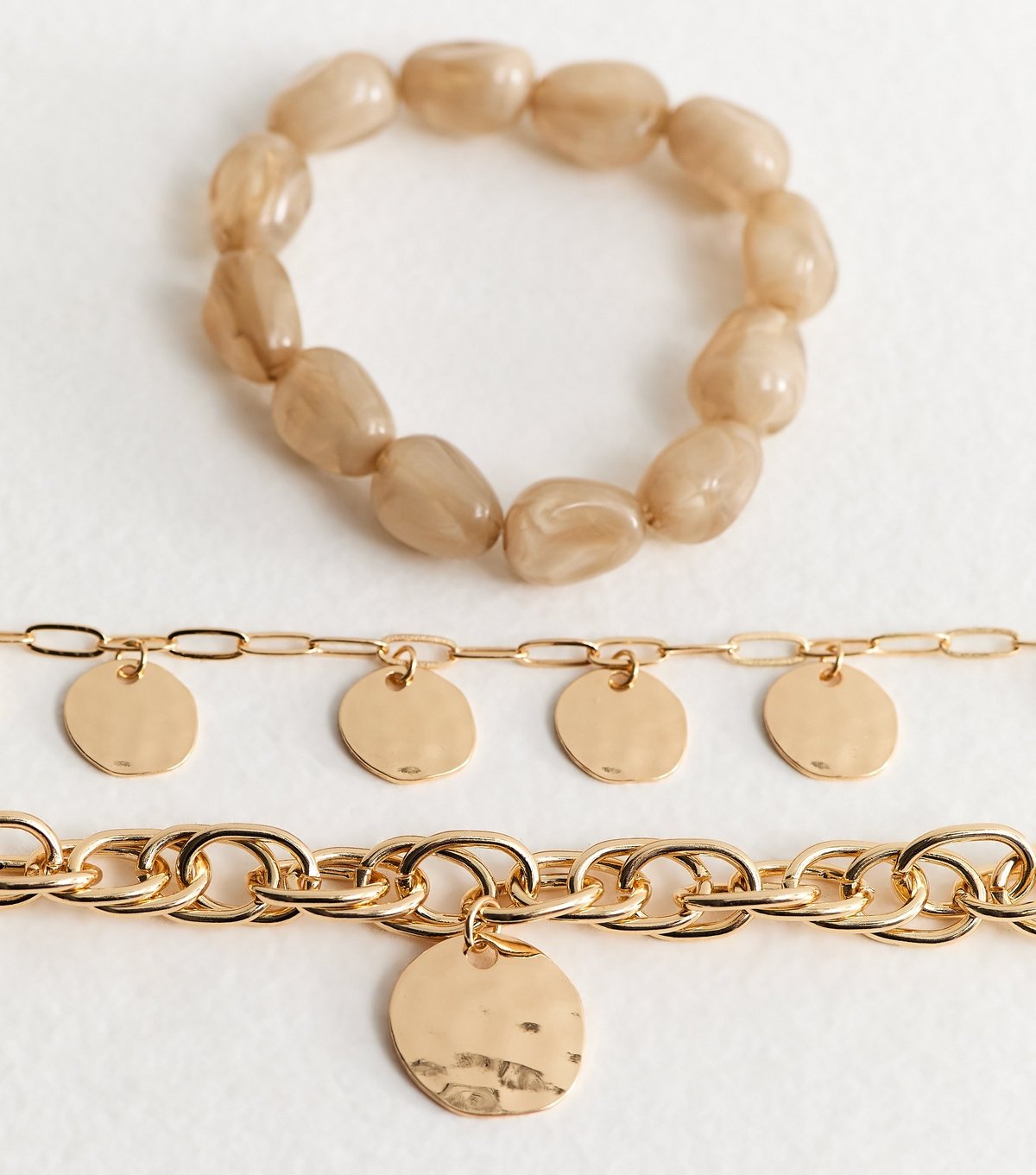 A set of three gold tone and resin bead bracelets from New Look. Each bracelet features a unique design with beads, chain links, and circle pendants. Perfect for adding a touch of elegance to any outfit.