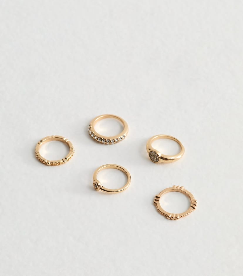 The New Look Gold Tone Diamanté Rings Pack of 5 is available in sizes l, m, s.