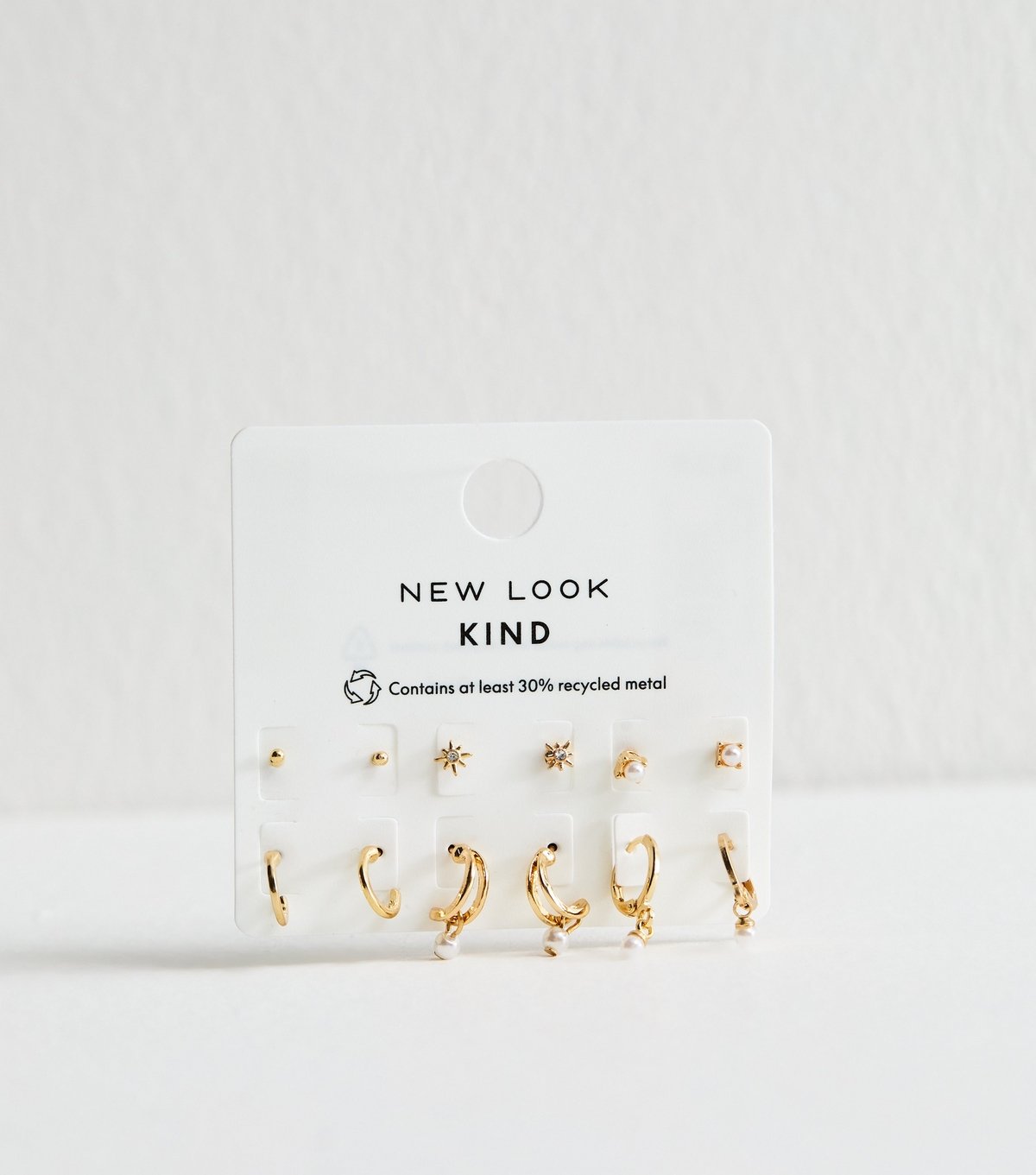 Elegant gold tone mini hoop and stud earrings set from New Look. Features faux pearl, diamante, and star designs. Ideal for adding a touch of sparkle to any outfit.