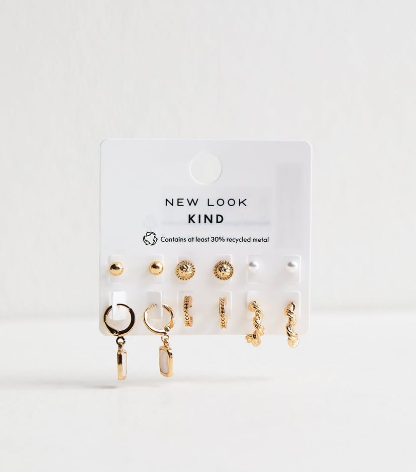 Elegant gold tone earrings set from New Look. Includes three pairs of studs and three pairs of hoops, perfect for versatile styling. Ideal for adding a touch of glamour to any outfit.