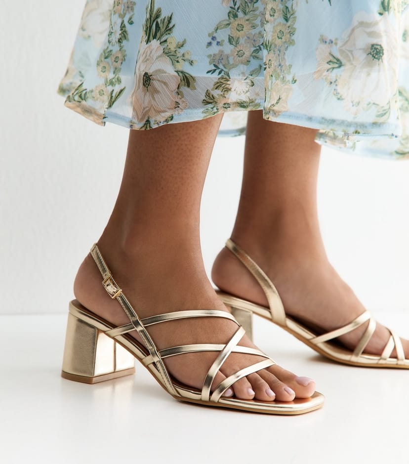The New Look Gold Faux Leather Block Heel Sandals is available in sizes 3, 4, 5, 6, 7, 8, 9.