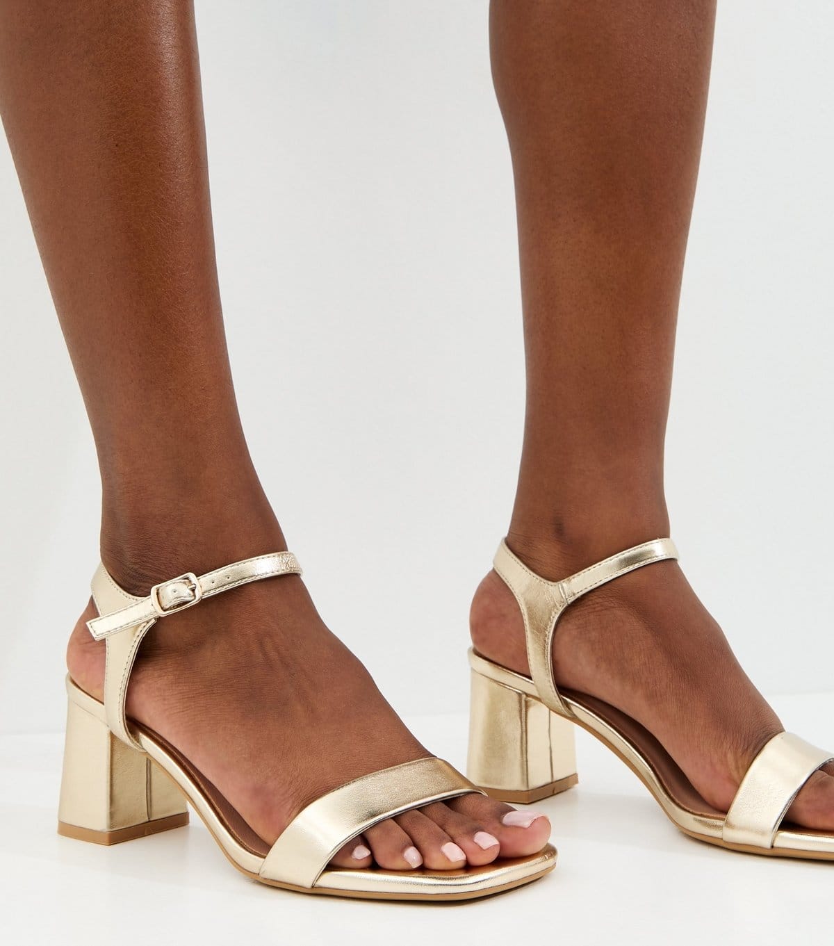 The New Look Gold Faux Leather Block Heel Sandals is available in sizes 3, 4, 5, 6, 7, 8, 9.