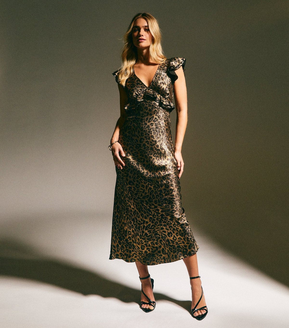 The New Look Gold Foil Animal Print Midi Dress is made from woven, foil finish.