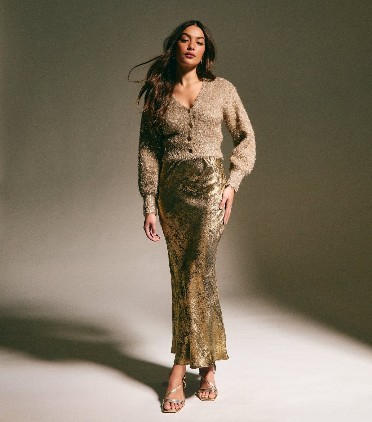 The New Look Gold Metallic Bias Cut Midi Skirt is available in sizes 10, 12, 14, 6, 8.