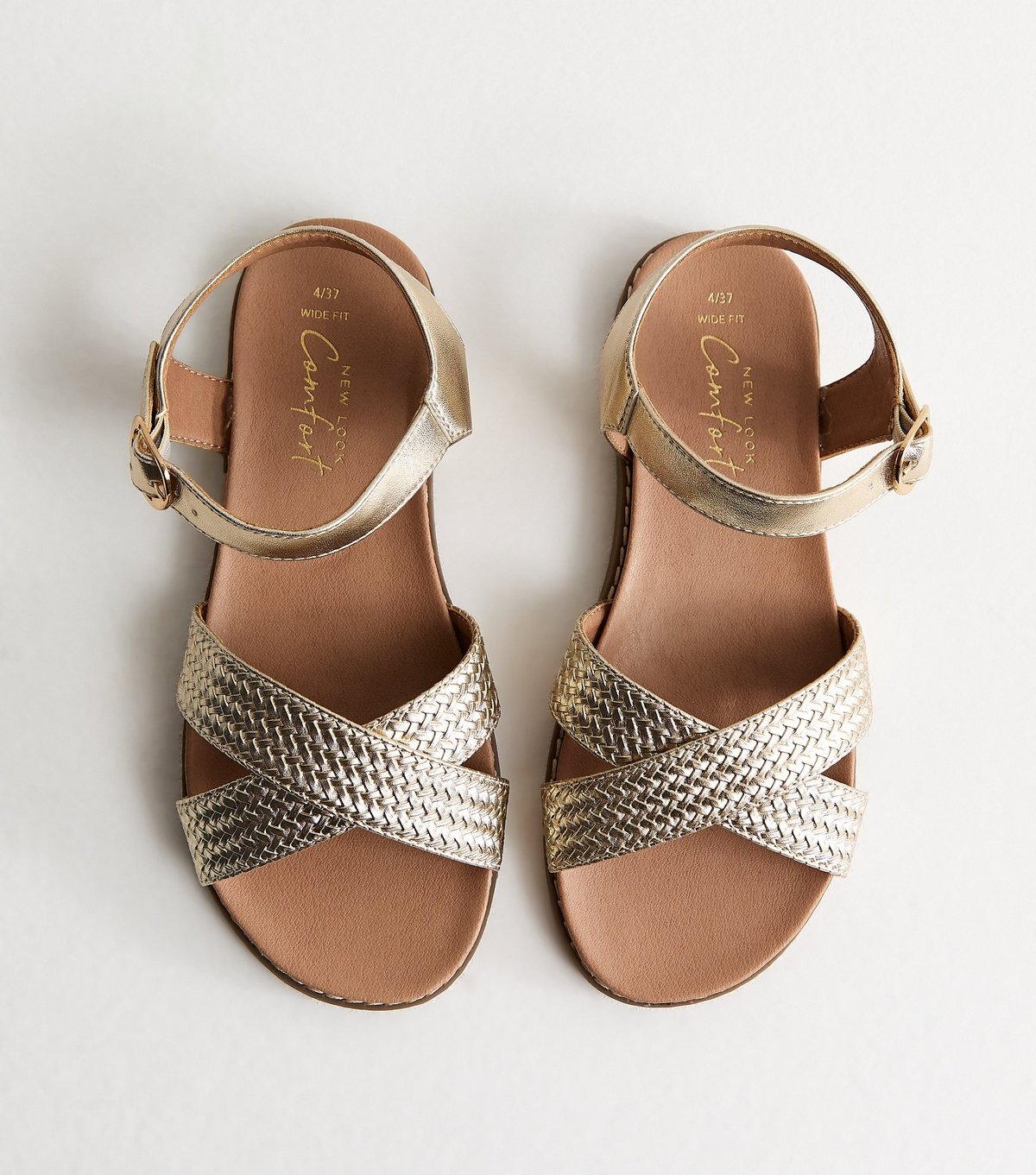 The New Look Gold Vegan Cross Over Sandals is available in sizes SIZE 3 - WIDE FIT, SIZE 4 - WIDE FIT, SIZE 5 - WIDE FIT, SIZE 6 - WIDE FIT, SIZE 7 - WIDE FIT, SIZE 8 - WIDE FIT, SIZE 9 - WIDE FIT.