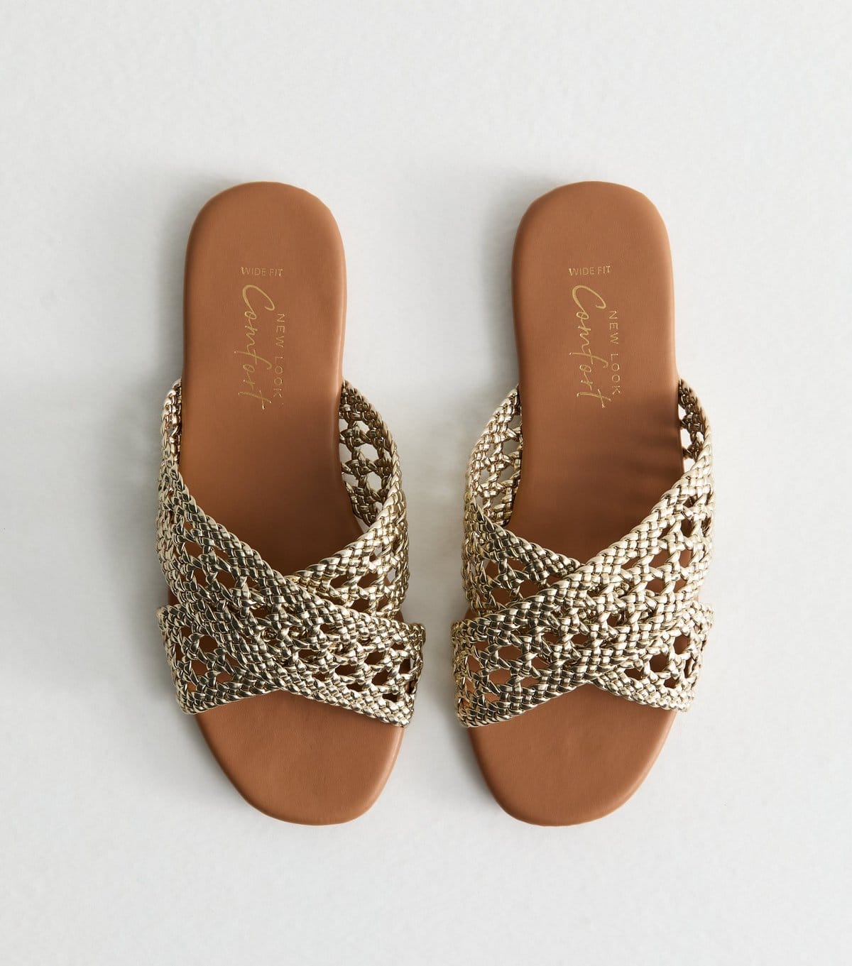 The New Look Gold Woven Strap Mule Sandals is available in sizes SIZE 3 - WIDE FIT, SIZE 4 - WIDE FIT, SIZE 5 - WIDE FIT, SIZE 6 - WIDE FIT.