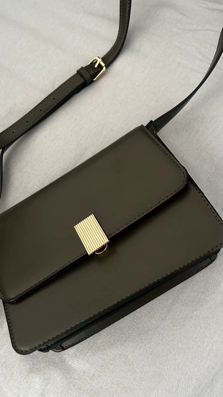 This dark green faux leather bag from New Look features a sleek design with gold detail buckle and a magnetic snap shut for easy access. Perfect for adding a touch of elegance to any outfit.