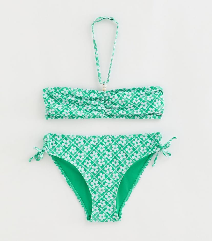 The New Look Green Floral Ruched Bikini Set is available in sizes 10-11 years, 12-13 years, 14-15 years, 9 years.
