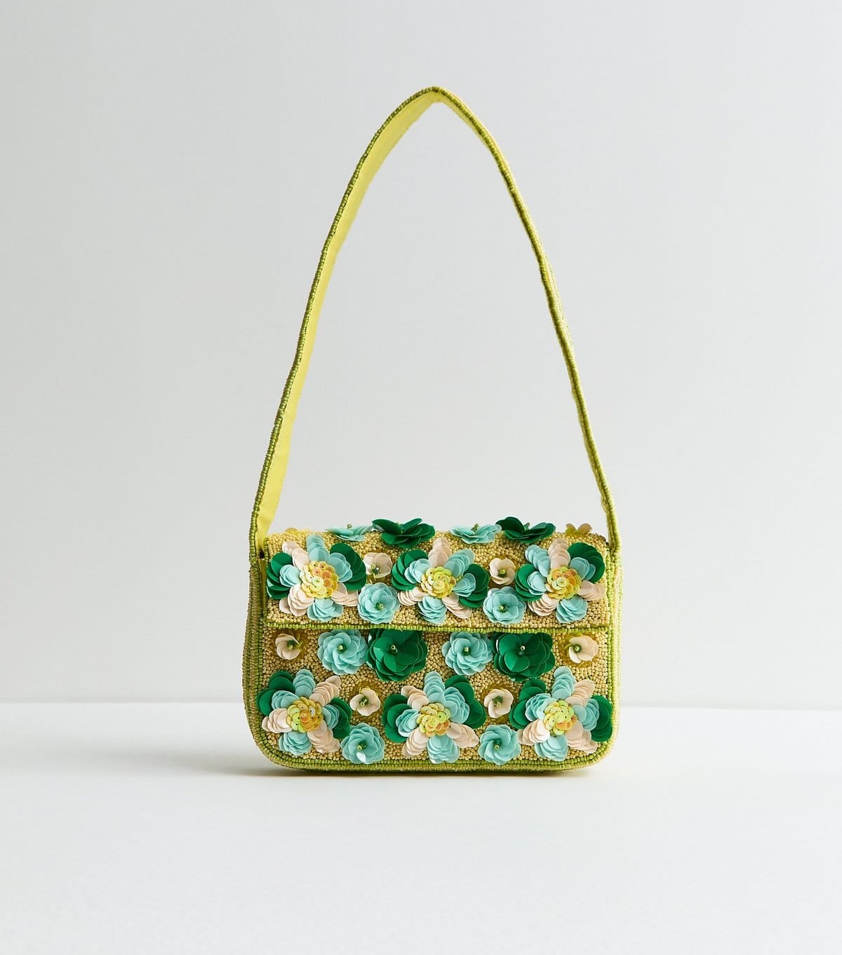 Sparkly green shoulder bag from New Look featuring a fabric base adorned with sequinned flowers. The bag has a yellow strap and silver-tone hardware. Perfect for adding a touch of glamour to any outfit.