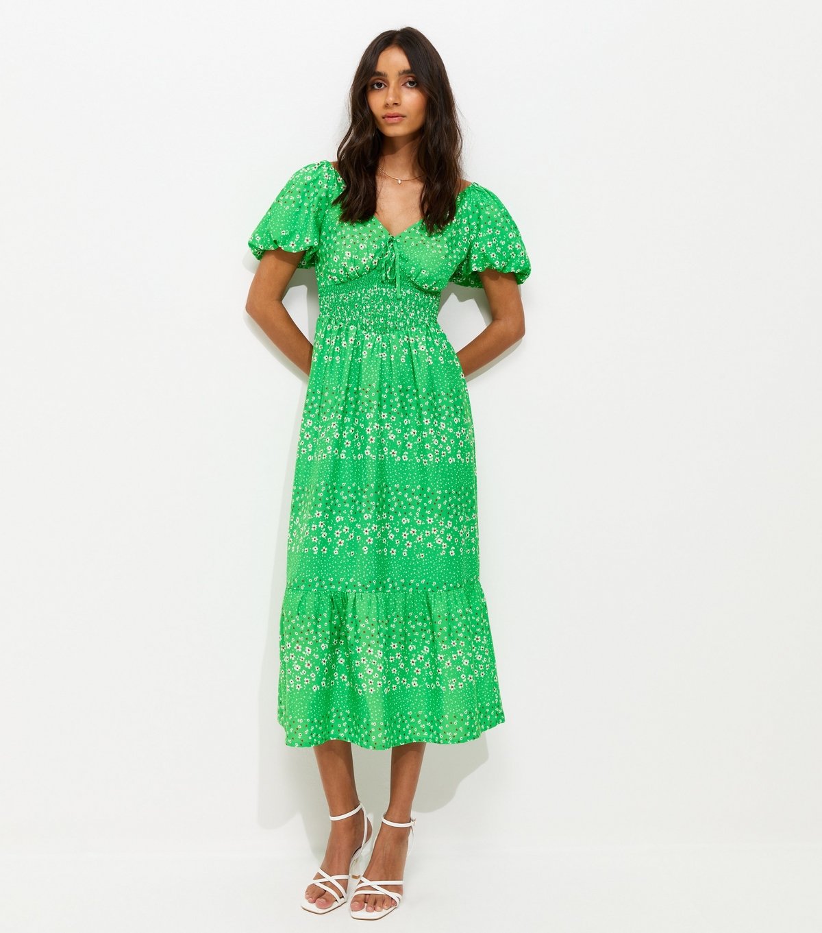The New Look Green Crepe Floral Midi Dress is available in sizes 10, 12, 14, 16, 18, 20, 6, 8.