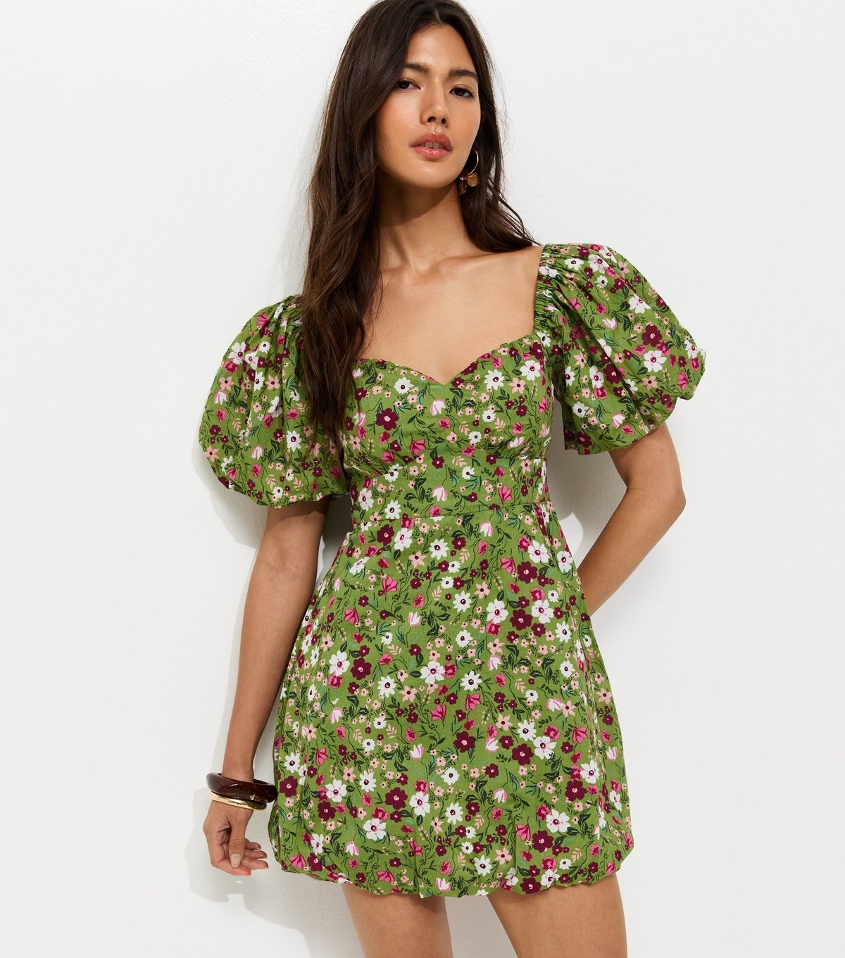 This green floral mini dress by New Look features statement puff sleeves and a bold floral print. The elasticated back panel ensures a comfortable and easy fit. Ideal for casual outings or summer events.