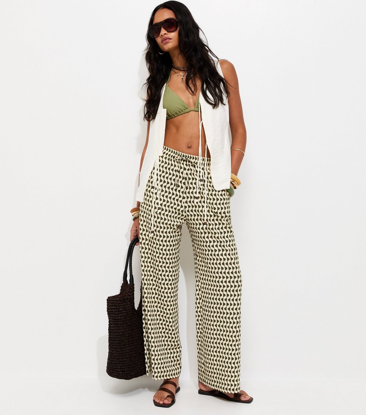 The New Look Green Geometric Crinkle Wide Leg Trousers is available in sizes 10, 12, 14, 16, 18, 20, 6.