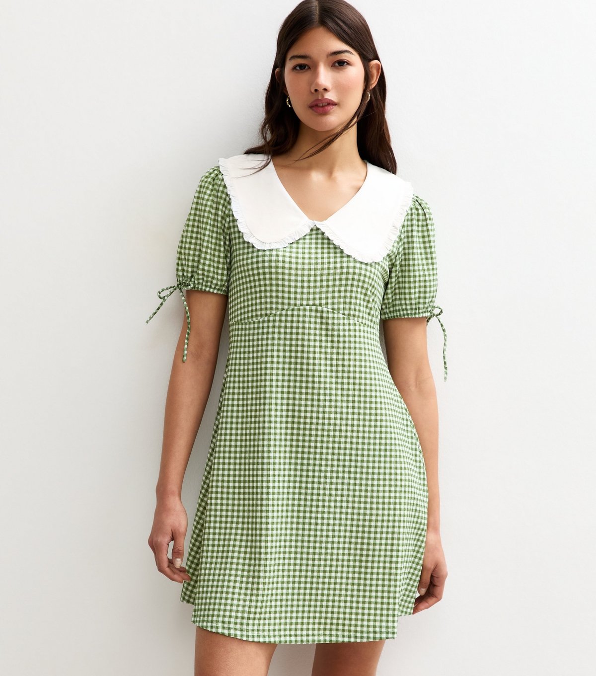 Charming green gingham check mini dress with a white peter pan collar and frilly trim. Features tie sleeves and a crinkle texture fabric. Ideal for a preppy look.