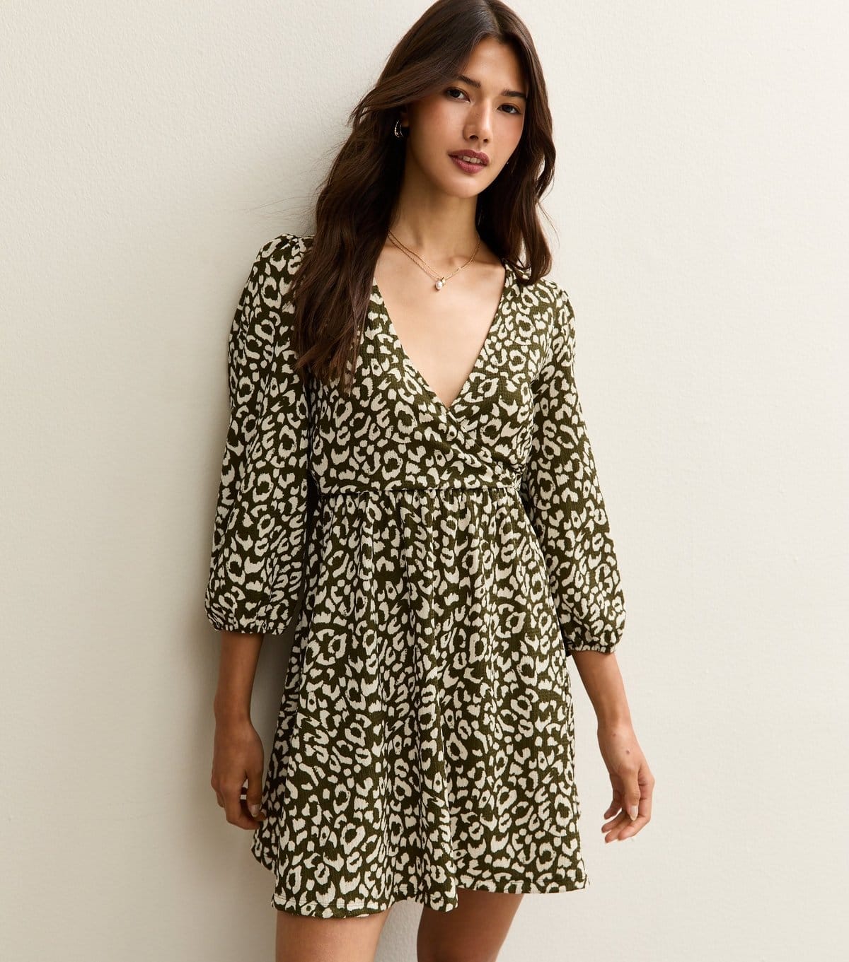 This green leopard print smock mini dress by New Look features a V-neckline and relaxed sleeves. Made from crinkle jersey, it's perfect for late summer to autumn.