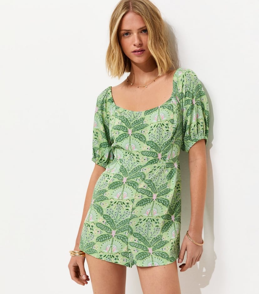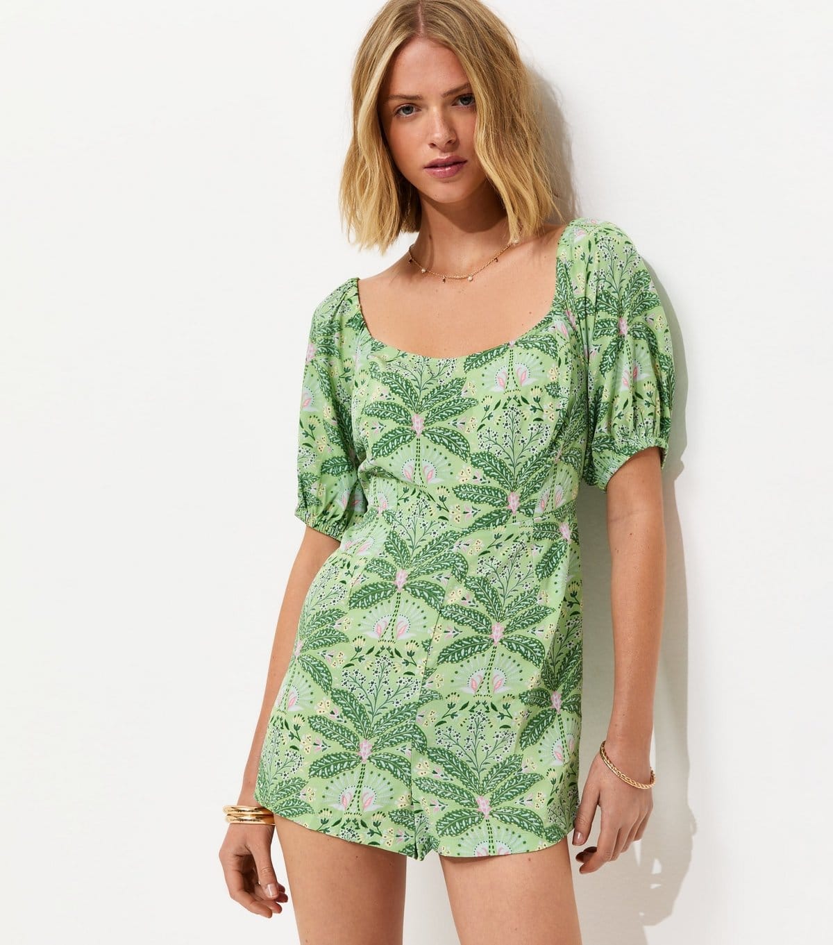Playful and vibrant, this short green palm tree print jumpsuit is perfect for summer. Featuring puff sleeves and a fitted silhouette, it's ideal for warm days.