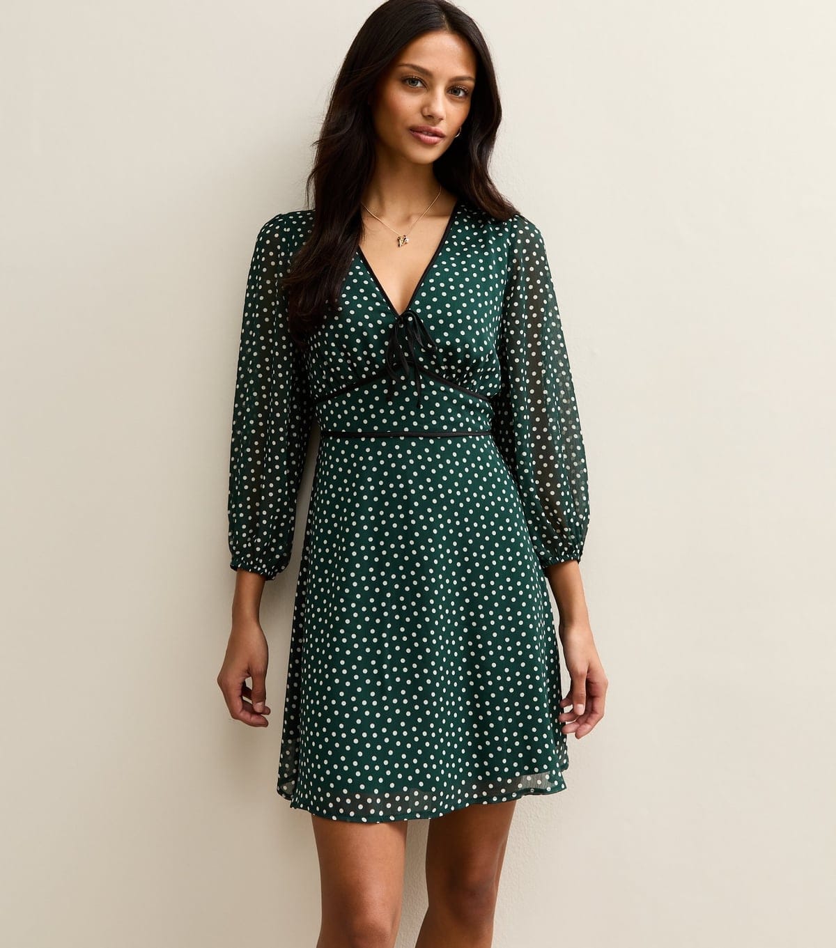 The New Look Green Polka Dot Long Sleeve Mini Dress is made from chiffon.