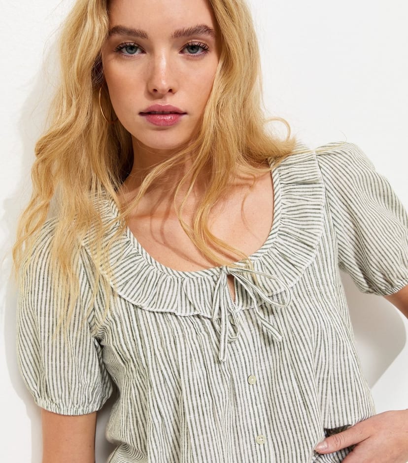 The New Look Green Striped Frill Neckline Blouse is made from cotton, linen.