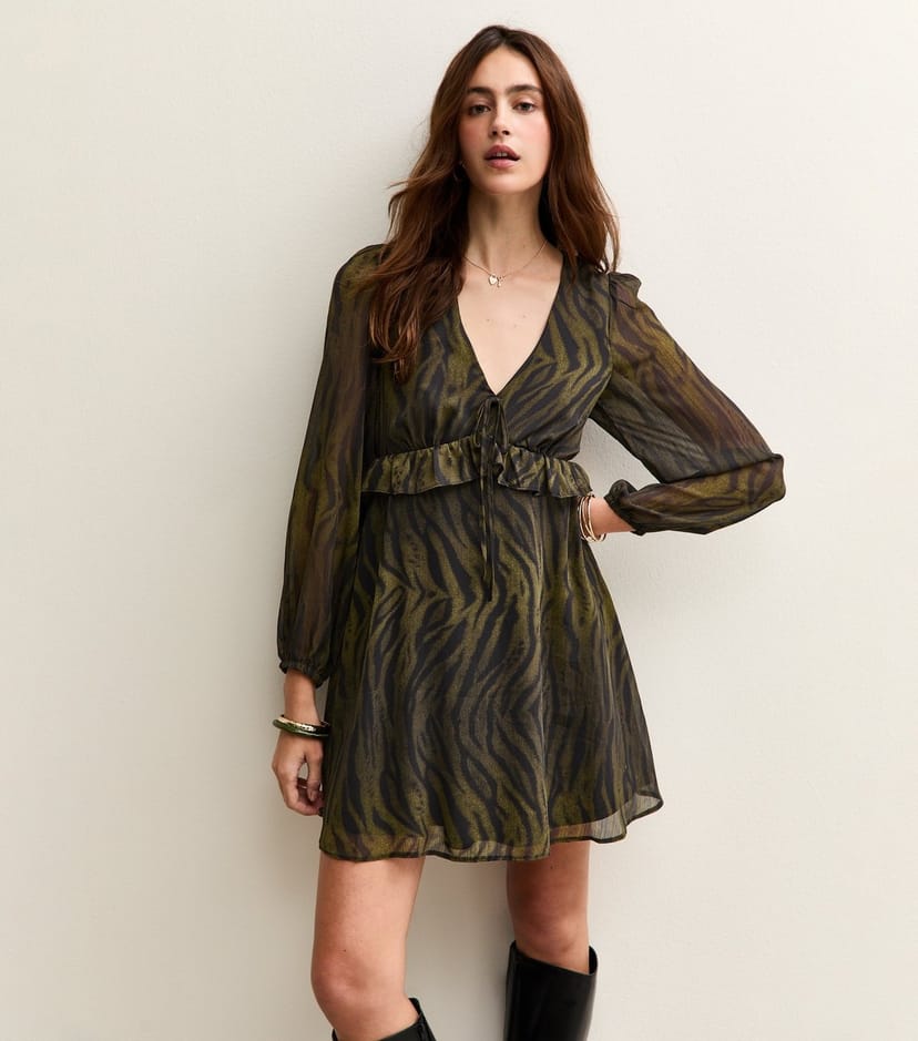 Channel fierce style in your day to day with this green tiger-print mini dress from New Look. It's cut from chiffon with a tie detail at the V-neckline and a ruffled trim. Perfect for casual outings.