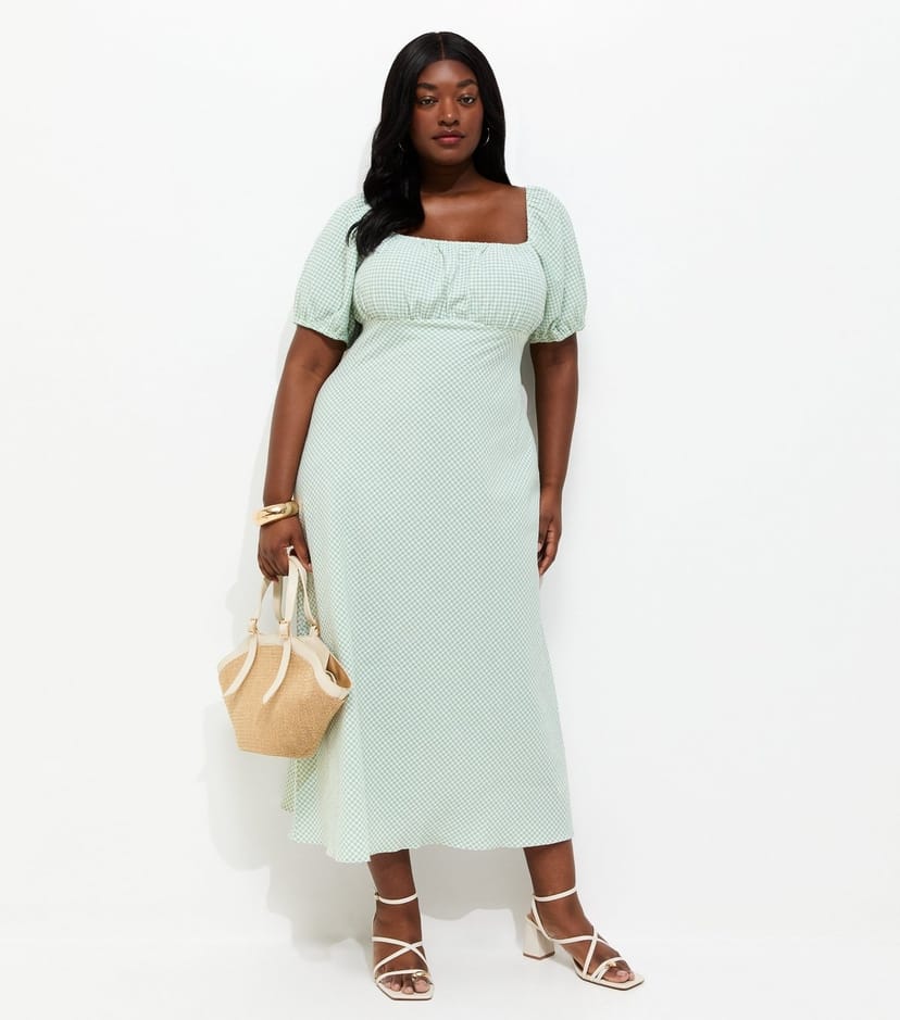 The New Look Green Gingham Milkmaid Midi Dress is available in sizes 18, 20, 22, 24, 26, 28, 30, 32.