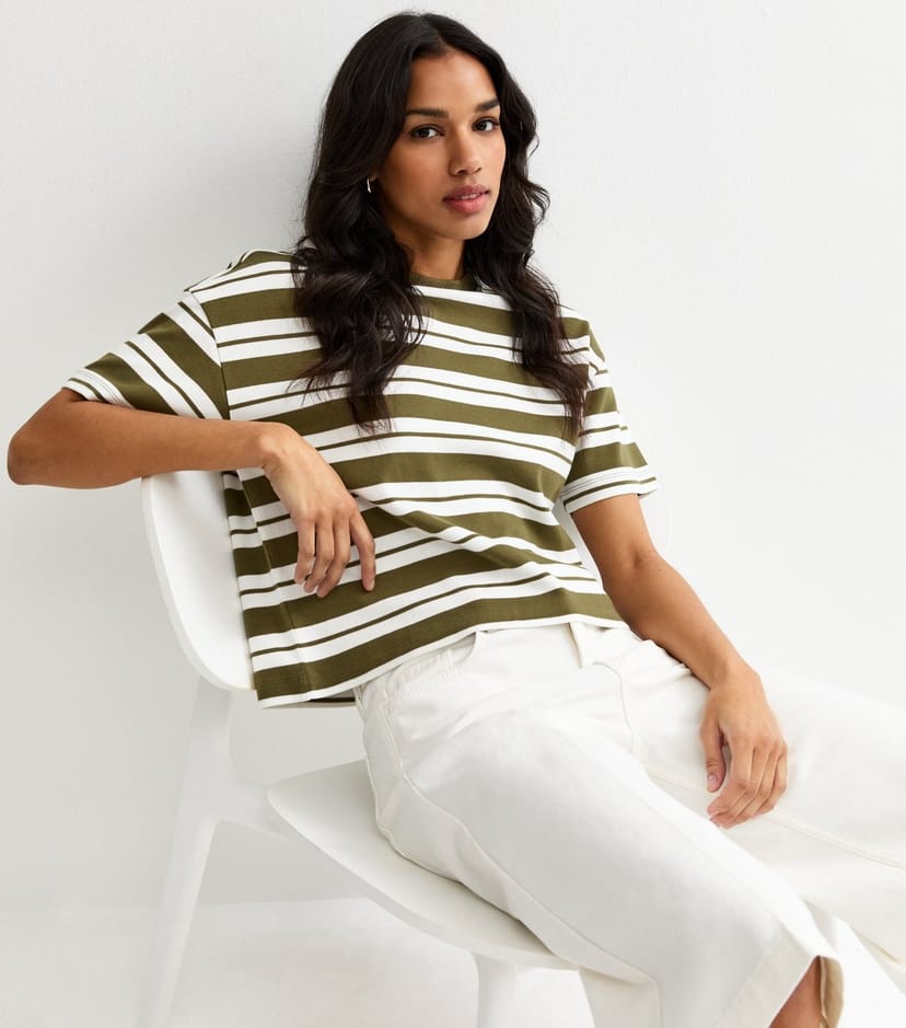 The New Look Green Striped Heavyweight Cotton T-Shirt is available in sizes 10, 12, 14, 16, 20, 6, 8.