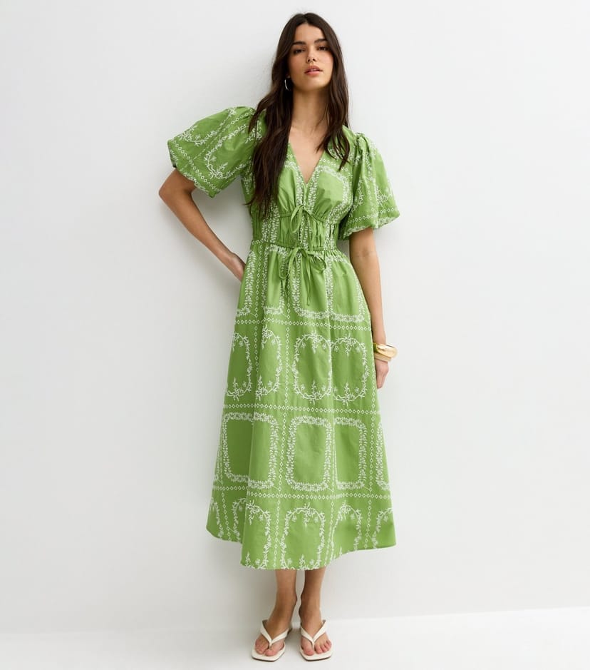 The New Look Bright Green Embroidered Puff Sleeve Midi Dress is available in sizes 10, 12, 14, 16, 18, 8.