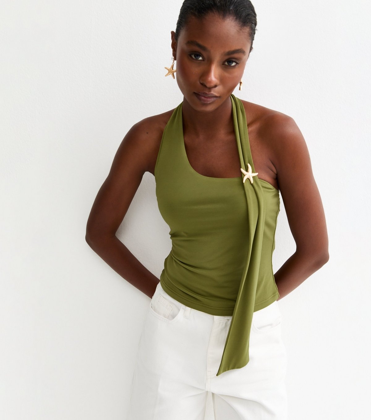 Chic olive jersey halter neck top with a scarf-like silhouette and a starfish charm. Ideal for sunny days or layering with a blazer.