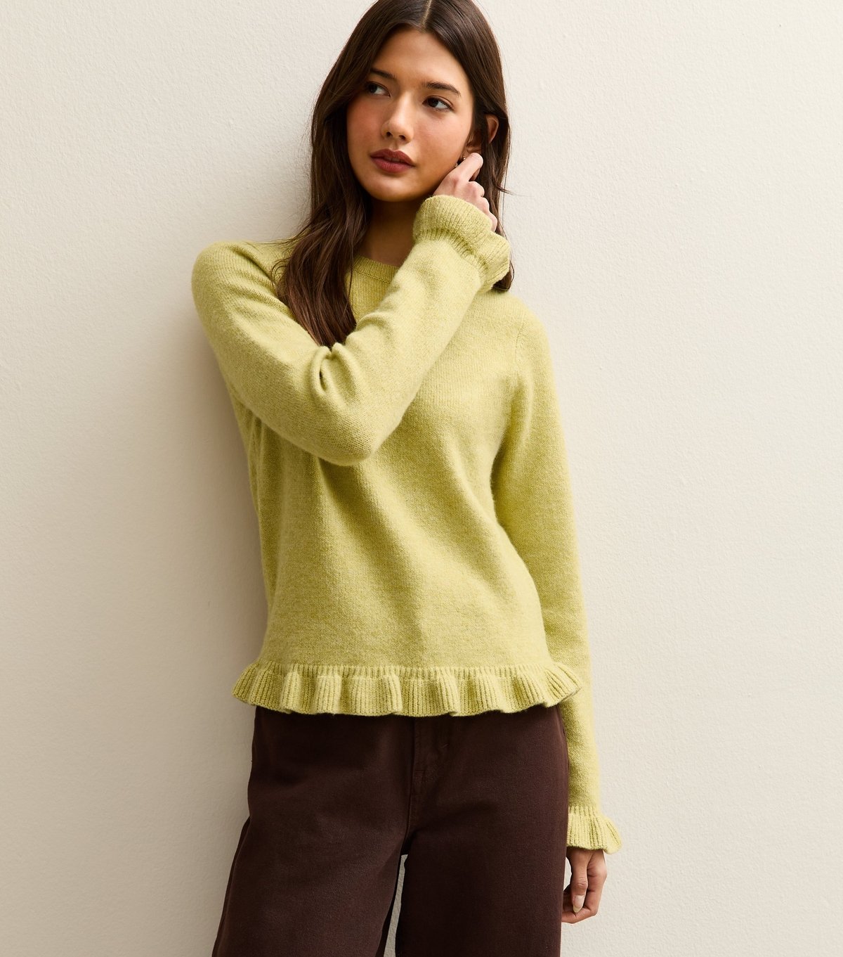 This light green crew neck jumper by New Look is a vibrant addition to your casual wardrobe. Featuring a midweight knit fabric with frilly trims for a chic detail. Perfect for layering over your favourite tops.