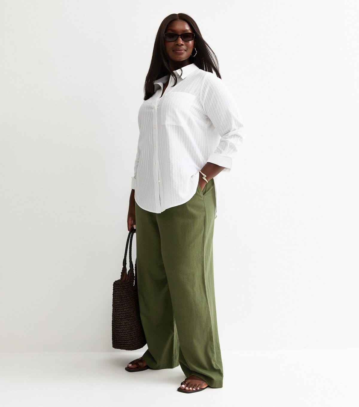 The New Look Green Linen Blend Wide Leg Trouser Plus Size is available in sizes 18, 20, 22, 24, 26, 28, 30, 32.