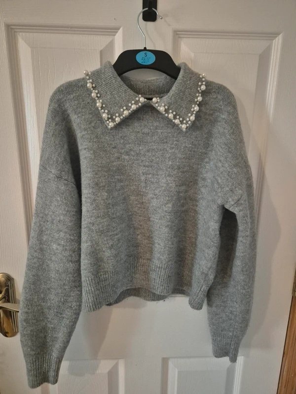 The New Look Pearl Detail Jumper in Grey is available in sizes M.