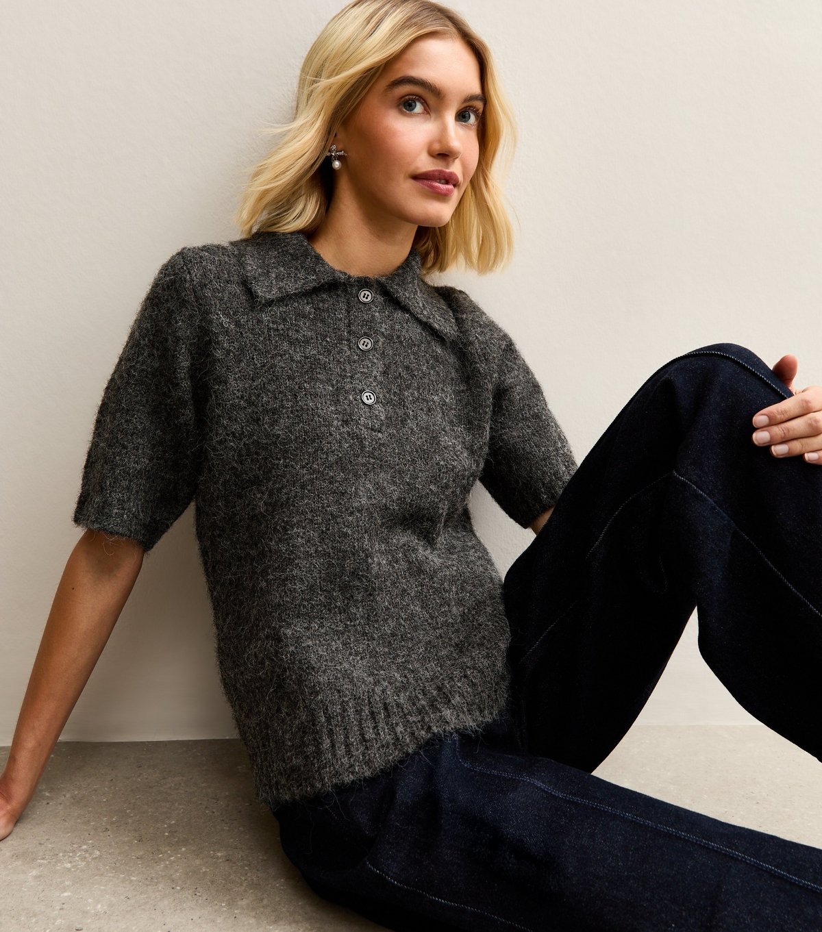 The New Look Grey Textured Knit Polo Collar Top is available in sizes L, M, S.