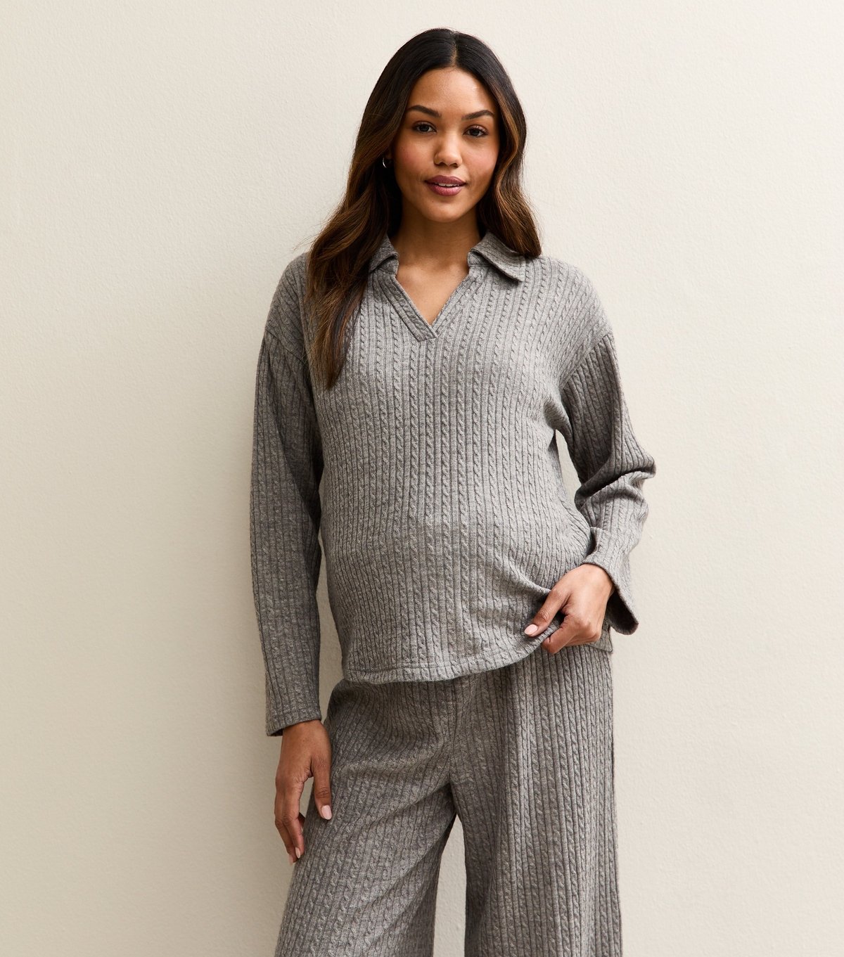 This maternity polo top by New Look is designed for comfort and style. Made from soft touch fabric, it features a cable-knit pattern for a cozy look. Ideal for relaxing at home or casual outings.