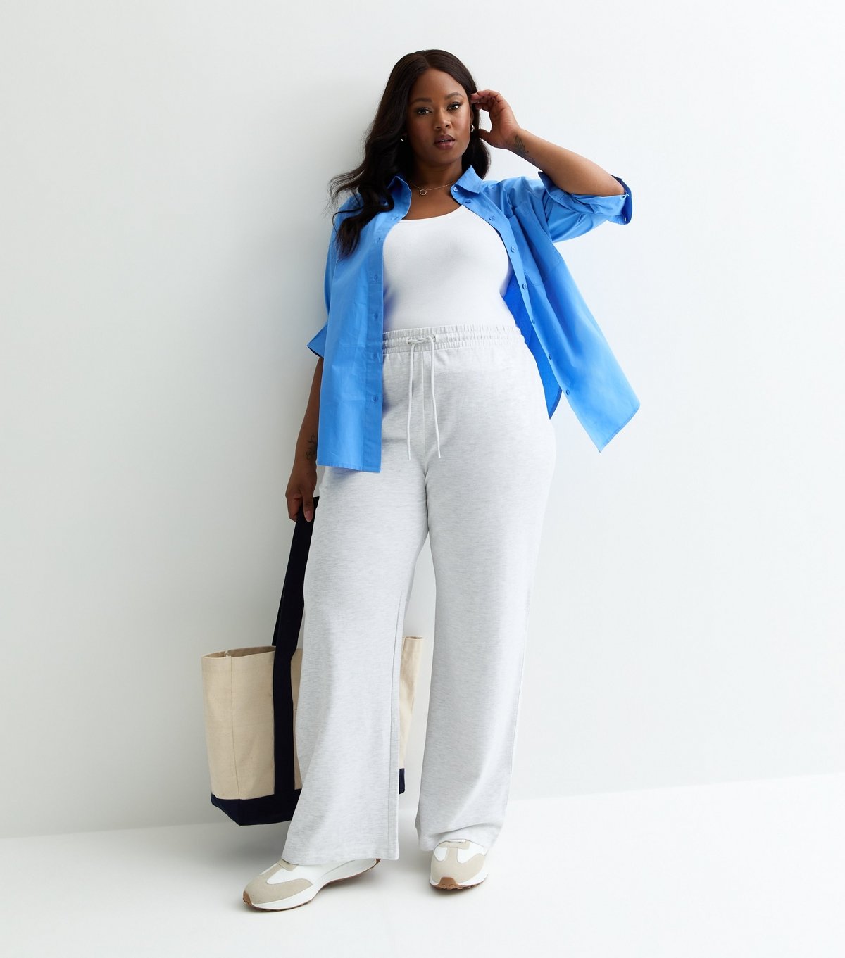 Plus size grey wide leg joggers by New Look. Made from a cotton-blend jersey fabric, these joggers feature a relaxed fit and an elasticated waist for comfort. Ideal for everyday wear.