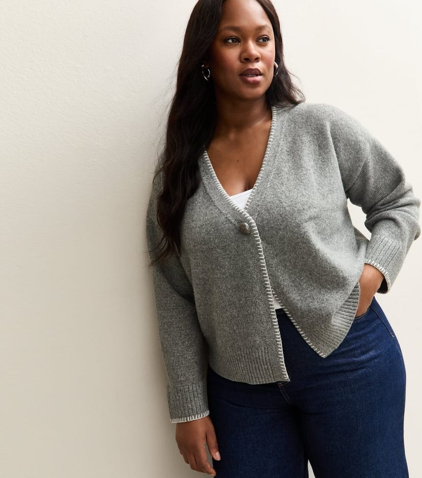 The New Look Mid Grey Knit V-Neck Cardigan is available in sizes 18, 22, 26, 30.