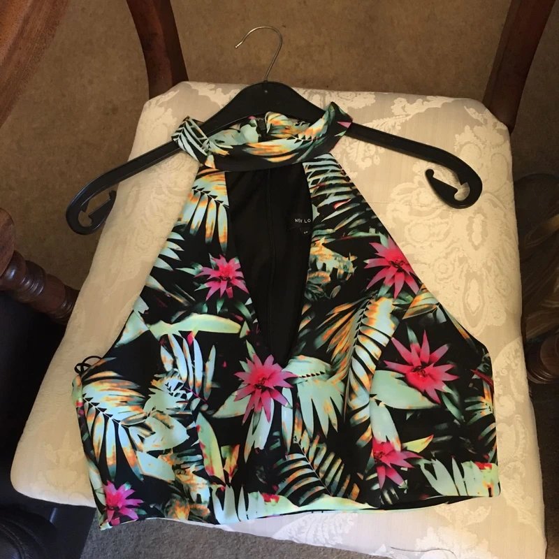 This never worn summer crop top features a halter neck with a tropical Hawaiian pattern. The back showcases a unique design while the front highlights a tasteful cleavage.