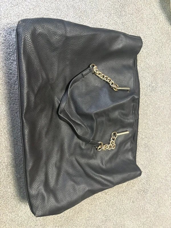 Stylish black leather-look handbag from New Look. Features a textured leather-like exterior, gold-tone chain straps, and a zipper closure. Perfect for everyday use.