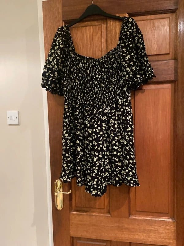 Charming New Look jumpsuit in black and white floral print. Features an elastic top and a full skirt for a relaxed summer look. Ideal for casual outings.