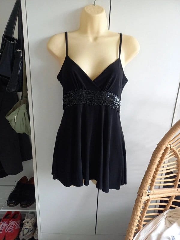 View Vinted's returns policyElegant black sequin embellished cami top from New Look. Perfect for transitional styling, pair with wide-leg trousers and heels for a chic look. A versatile addition to your capsule wardrobe.