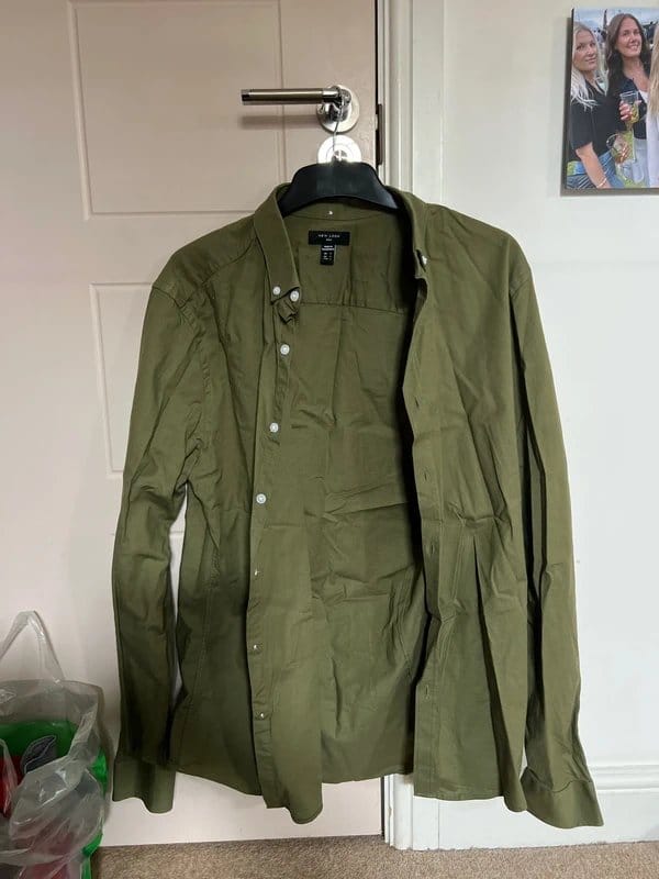 The New Look Khaki Green Men's Button-Up Shirt is available in sizes L.